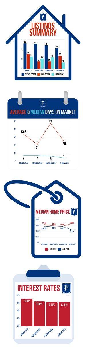 As interest rates continue to trend downward after peaking above 7%, buyer activity continues to increase. That increased buyer activity led to the median days on market to be just four days in January — the lowest since April of 2021. The good news for those buyers was that 34 new listings were introduced to the market after consecutive months of just 19 new listings. Yearly seasonal trends indicate that the number of new listings will continue to increase through the summer months, which will be a welcome sight.
